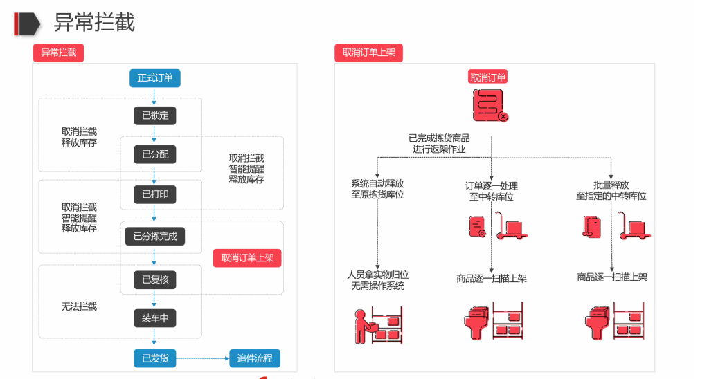 2. 库存层拦截:系统实时校验库存,锁定无货、库存不足、商品过期/破损的订单,禁止拣货。
